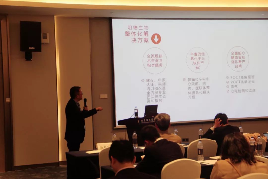 明德生物市場總監(jiān)蔡發(fā)宣做了胸痛中心、卒中中心、心電網(wǎng)絡(luò)軟硬件一體化建設(shè)解決方案的演講,充分展示了明德生物在急危重癥醫(yī)療服務(wù)領(lǐng)域的實力和優(yōu)勢。