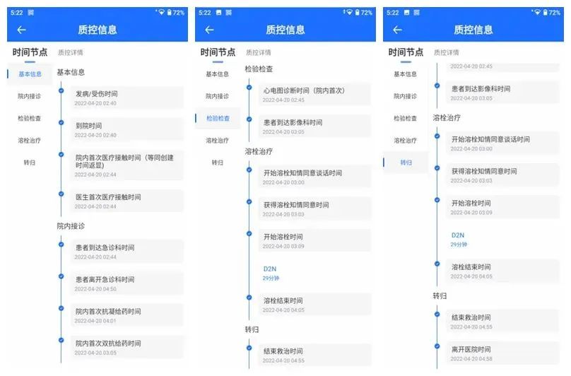 救治過程中,各項關鍵時間節(jié)點通過胸痛中心信息化系統(tǒng),結合物聯(lián)網(wǎng)的方式自動記錄采集,幫助醫(yī)護在緊張的救治過程中快速記錄時間節(jié)點,使得醫(yī)護精力可以專注在危重患者救治上,在救治的同時,實時掌握質(zhì)控指標達成情況。